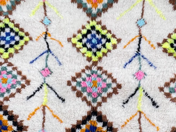 Chaque tapis Azilal que nous proposons est une pièce d’art soigneusement tissée à la main par des artisans passionnés, perpétuant une tradition séculaire transmise de génération en génération. Les motifs géométriques et les couleurs vibrantes racontent une histoire propre à chaque pièce, capturant l’esprit de la culture berbère.