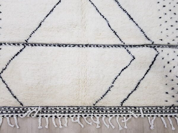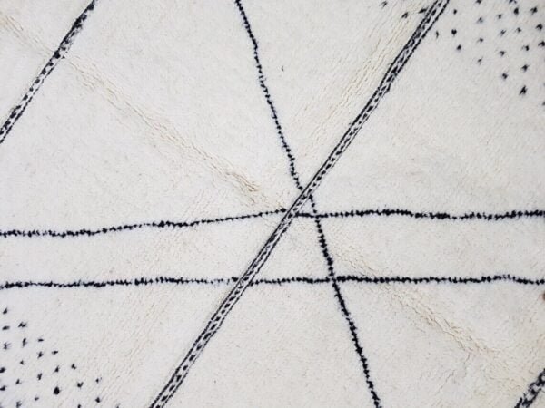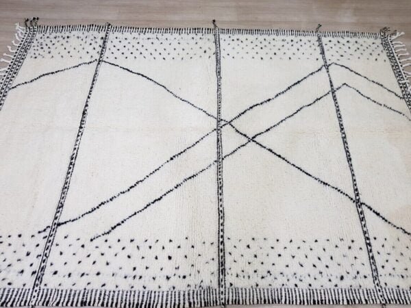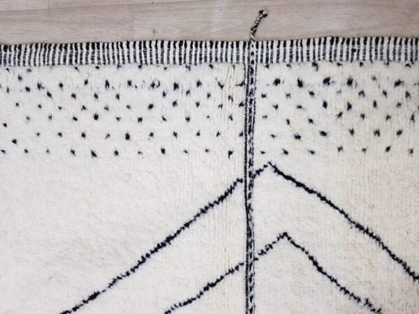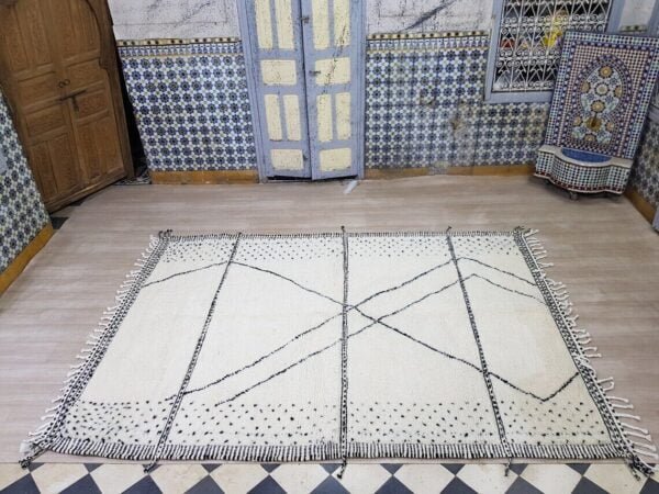 Vous cherchez à ajouter de la chaleur et de l’authenticité à votre intérieur. Notre tapis berbère marocain Beni Ouarain sur-mesure est la solution idéale pour vous ! Fabriqué à la main par des artisans qualifiés au Maroc, ce tapis est entièrement en laine, ce qui le rend doux, résistant et confortable pour marcher ou s’asseoir dessus. Chaque tapis est unique et présente des motifs géométriques traditionnels qui racontent l’histoire de la tribu berbère qui les a créés.