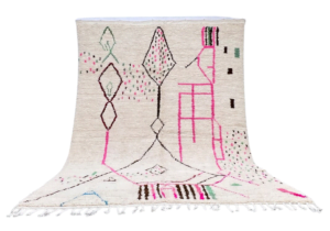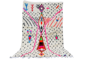Les tapis azilal tirent leur nom de la région d’Azilal, nichée dans les montagnes du Haut Atlas au Maroc. C’est dans ce cadre pittoresque que les femmes berbères perpétuent depuis des siècles l’art du tissage de tapis. Chaque tapis azilal raconte une histoire unique, imprégnée de la culture et des traditions de la tribu qui l’a créé