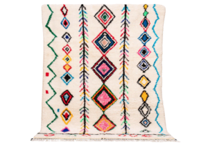 Les tapis azilal se distinguent par leur esthétique vibrante et éclectique. Les motifs géométriques audacieux et les couleurs vives sont des signatures de ces pièces uniques. Traditionnellement, les tapis azilal sont tissés avec de la laine naturelle, ce qui leur confère une texture douce et durable. Chaque tapis est une expression artistique de la créativité et de la maîtrise artisanale de son créateur.